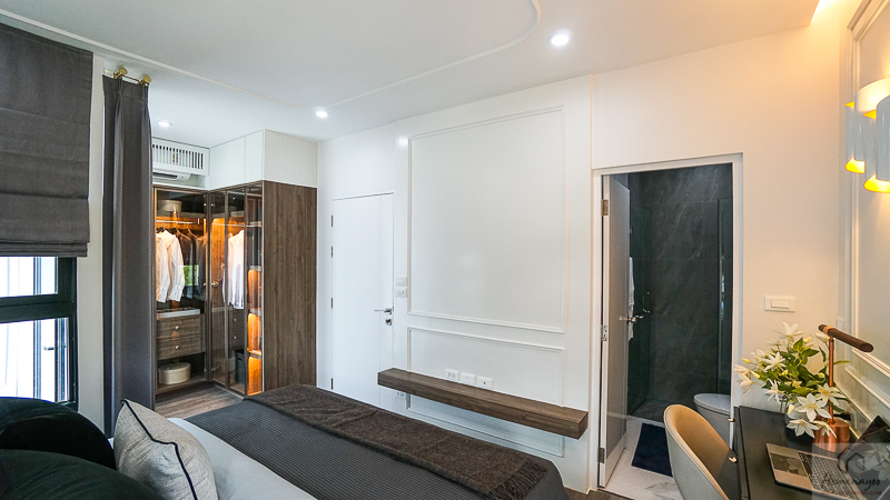 ข้างเตียงอีกฝั่งมีพื้นที่ให้วางตู้เสื้อผ้า โต๊ะเครื่องแป้งได้ ขวามือเป็นประตูเข้าห้องน้ำจากในห้องนอน
