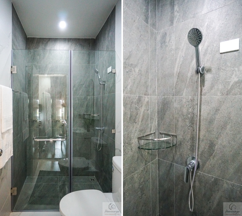 ด้านในเป็นพื้นที่ส่วนเปียก ติดตั้งฝักบัวของ American Standard พร้อมเดินงานระบบไฟฟ้าติด Junction Box รองรับการติดตั้งเครื่องทำน้ำอุ่นมาให้เรียบร้อย