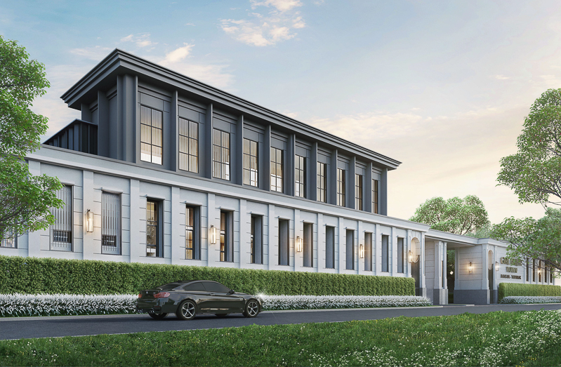 ซุ้มประตูโครงการออกแบบมาในสไตล์ New Modern English เน้นเสาสูงตกแต่งด้วยเส้นตรงและเส้นโค้ง ดูเรียบหรู กำแพงหน้าโครงการสูง 6 ม. เพิ่มความเป็นส่วนตัวให้กับลูกบ้าน