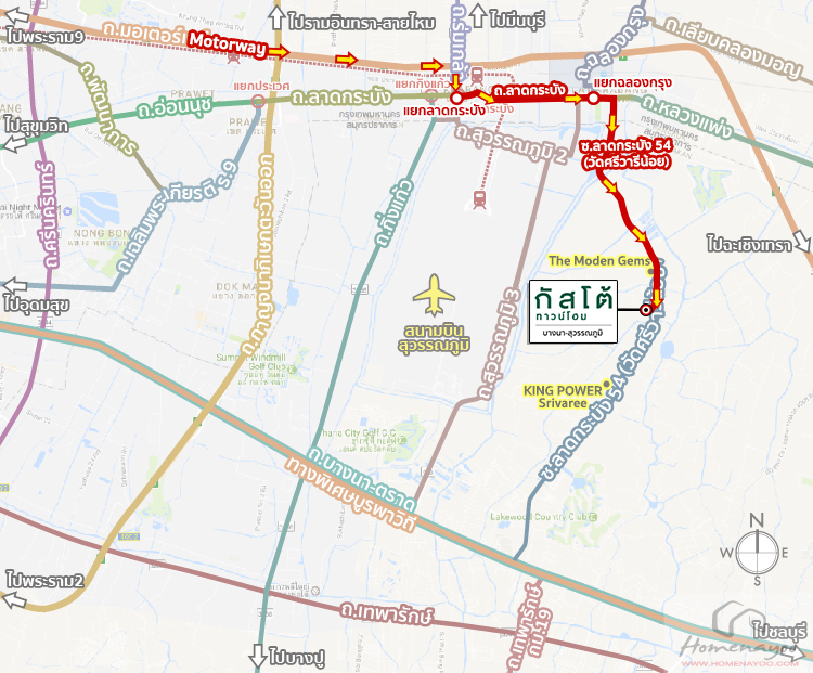 การเดินทางเริ่มจาก แยกลาดกระบัง ถ.ลาดกระบัง ⇒ แยกฉลองกรุง ⇒ ซ.ลาดกระบัง 54 (วัดศรีวารีน้อย) ขับตรงไปอีก 6.2 กม. ถึงโครงการ กัสโต้ บางนา-สุวรรณภูมิ