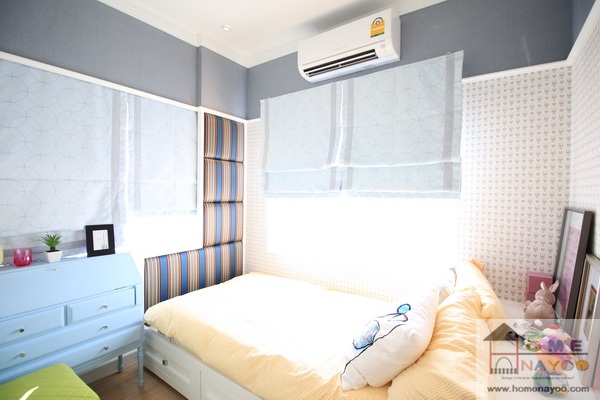 ภาพรวมภายในห้อง ตกแต่งเป็นห้องนอนเด็กผู้ชาย โทนสีน้ำเงินคะ