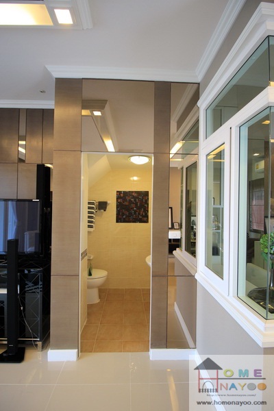 ติดกับห้องน้ำ จัดเป็นโซนสำหรับนั่งทำงาน หรือจะเปลี่ยนเป็นครัวภายในบ้าน กั้นบานกระจกเพิ่มเติมให้เป็นสัดส่วน ก็ลงตัวดีคะ