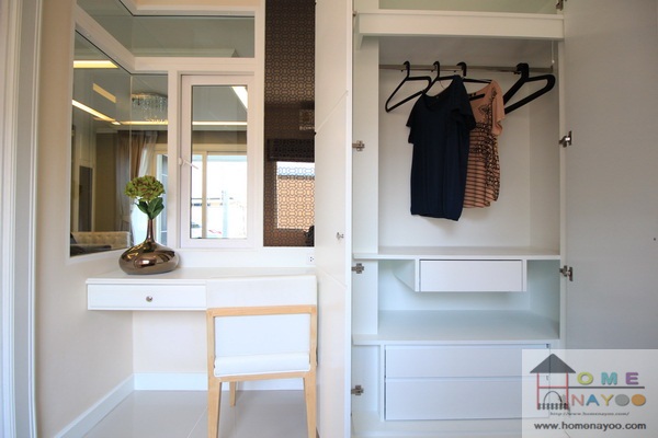 ข้างเตียง บิวท์อินเป็นโต๊ะเครื่องแป้ง และตู้เสื้อผ้าให้เราดูเป็นไอเดีย