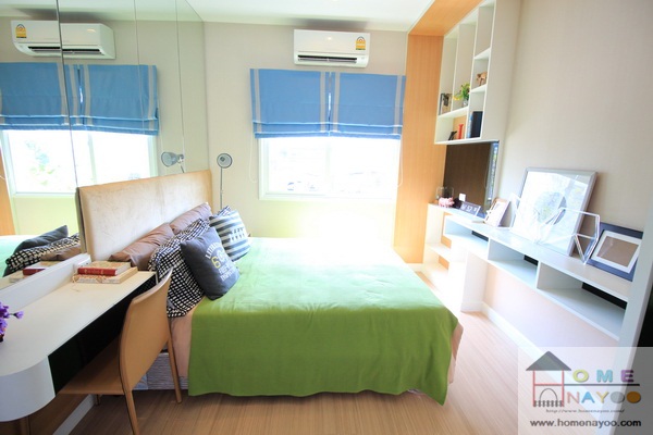 วางเตียงขนาด 5 ฟุต ข้างเตียงบิวท์อินโต๊ะทำงาน ปลายเตียงบิวท์อินเป็นชั้นวางทีวี ด้านบนเป็นชั้นวางของโชว์ ให้ดูเป็นไอเดีย