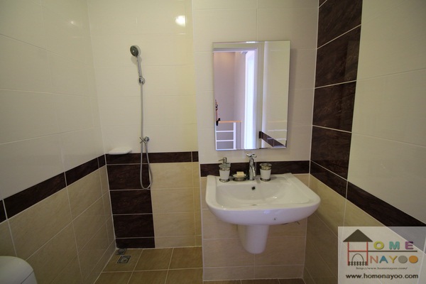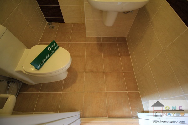 ภายในห้องน้ำไม่ได้มีการแบ่งส่วนแห้ง และส่วนอาบน้ำ >> ปูพื้นกระเบื้องกันลื่นสีส้ม ขนาด 30×30 ซม. ผนังก็ปูกระเบื้องโทนสีครีมสวยงาม