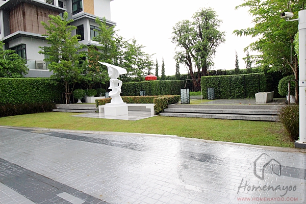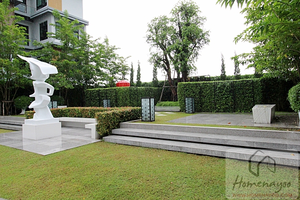 เข้ามาจะมีสวนหย่อมอยู่ทางฝั่งซ้ายมือติดกับซุ้มทางเข้าออกโครงการค่ะ ฟังก์ชั่นจริงๆของสวนหย่อมนี้คือเป็นฉากที่กั้นโรงเรียนสอนการแสดงที่อยู่ติดกับที่ดินโครงการนั่นเอง โดยออกแบบฉากมาได้น่าสนใจด้วยการใช้สี่เหลี่ยมผืนผ้าแนวตั้งมากมาย เรียงกันทั้งแนวตั้งและแนวนอนในองศาที่แตกต่างกัน โดยพื้นผิวเป็นหญ้าเทียมและระแนงไม้แนวตั้งแนวนอน ดูร่มรื่นและน่าสนใจกว่ากำแพงเรียบๆทั่วไป