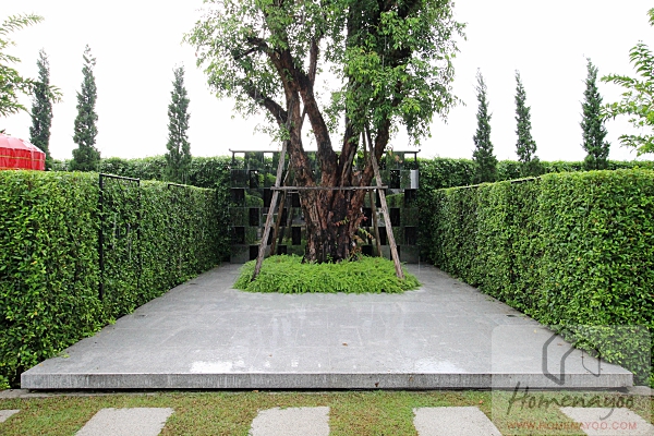 มีลานคอนกรีต ปลูกต้นไม้มาให้ทั้งไม้ยืนต้นให้ร่มเงา และไม้พุ่มคลุมดิน พร้อมรั้วต้นไม้แบ่งพื้นที่เป็นส่วนๆ