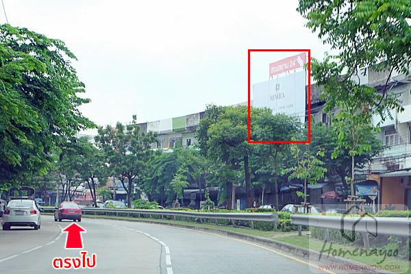 ตรงมาซักพักจะเห็นป้ายบอกทางขนาดใหญ่ของโครงการ H-Cape Minera รามอินทรา โดยป้ายอยู่ทางฝั่งขวามือเขียนชื่อซอยสวยสยาม 24 พร้อมลูกศรมาให้ พอเราเห็นป้ายก็วิ่งตามทางไปเรื่อยๆเพื่อหาจุดกลับรถไปอีกฝั่งค่ะ
