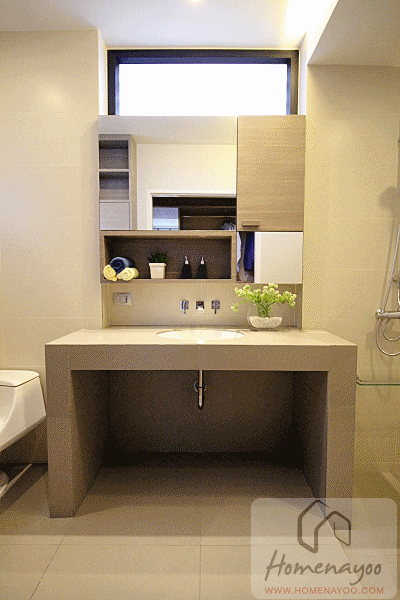 ส่วนอ่างล้างหน้าของห้องน้ำทำเคาน์เตอร์ด้านบนมาให้วางของเพิ่มพร้อมกระจกเงาได้ตามนี้ค่ะ แต่ชั้นวางของพร้อมบานปิดด้านล่างเคาน์เตอร์ห้องตัวอย่างทำมาให้ดูเป็นไอเดียเฉยๆของจริงไม่มีนะคะ
