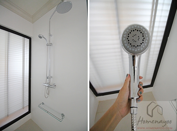 ชุดฝักบัวมาพร้อมกับ Rain Shower และมีติดที่วางของใต้ชุดฝักบัวมาให้ 2 ชั้น เทียบฝ่ามือกับฝักบัวให้ดูขนาดค่ะ