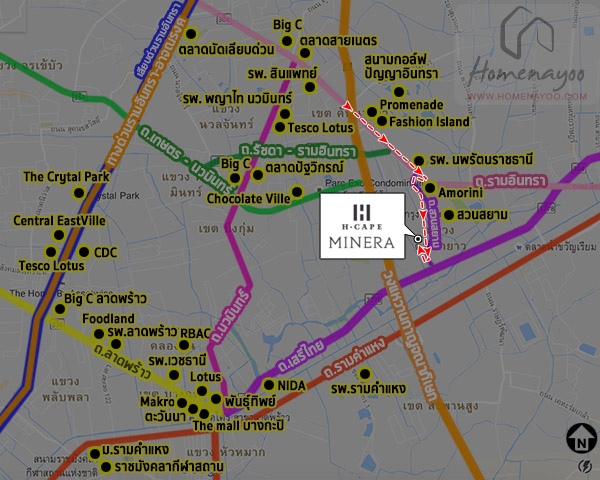 ทำเลโดยรอบ โครงการ H-Cape Minera รามอินทรา มีที่ตั้งอยู่บนถนนสวนสยาม (ซอยที่ตั้งของสวนสยามทะเลกรุงเทพฯ) ที่เชื่อมต่อทั้งถนนรามอินทราและถนนเสรีไทย จัดเป็นทำเลที่มีความสะดวกสบายใกล้จุดขึ้นลงมอเตอร์เวย์และวงแหวนกาญจนาภิเษก, ใกล้รถไฟฟ้าสายสีชมพู และมีความอุดมสมบูรณ์สูง