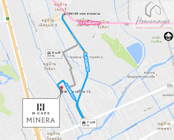 จากซอยสวนสยาม 24 เราตรงไปตามทางประมาณ 800 เมตร ก็จะเจอโครงการ H-Cape Minera รามอินทรา อยู่ทางฝั่งซ้ายมือแล้วค่ะ