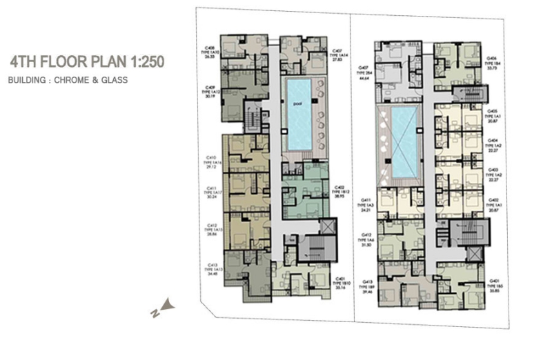 ตัวอาคารมีระยะห่างกันประมาณ 5 เมตรค่ะ ทั้ง 2 อาคารหันส่วนสระว่ายน้ำชนกันแต่อยู่คนละชั้น โดย CHROME สระว่ายน้ำและห้องฟิตเนสอยู่ชั้น 4 และ GLASS อยู่ชั้น