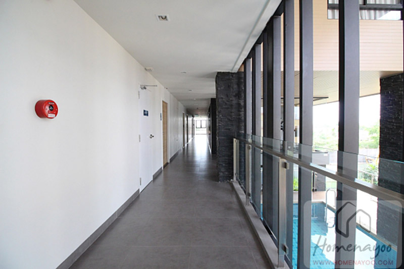 ส่วนโถงทางเดินแจกไปยูนิตที่พักอาศัยกว้าง 1.5 เมตร ติดไฟดาวน์ไลน์มาให้เป็นระยะๆ