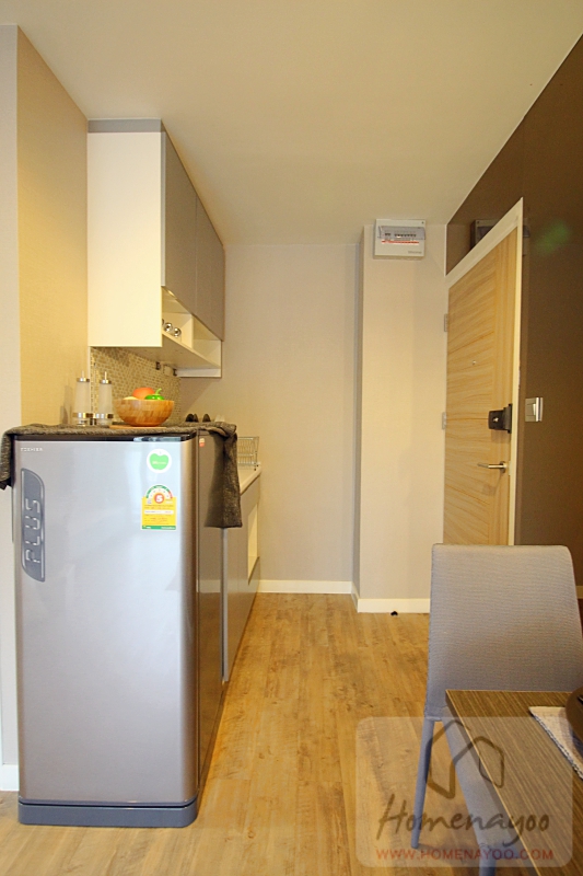 การออกแบบโครงการและวัสดุ – ตัวห้องขายแบบ Fully Furnished คือมีชุดครัวและชุดเฟอร์นิเจอร์แบบ Built in มาให้พร้อมแอร์ครบทุกยูนิต สำหรับราคานี้ก็ถือว่าเลือกวัสดุมาได้ค่อนข้างดีทีเดียว ได้ Digital Door Lock ทุกห้อง ฝ้าเพดานสูง 2.4 ม. เพดานติดไฟดาวน์ไลท์ พื้นเป็นไวนิลลายไม้ที่มีความทนทานกว่าลามิเนต และห้องน้ำกับระเบียงจะเป็นกระเบื้องเซรามิกที่มีความทนทาน สุขภัณฑ์ Mogen พร้อมฉากกั้นห้องน้ำ และห้องครัวมาให้ พร้อมเฟอร์นิเจอร์ Built in ซึ่งช่วยเพิ่มพื้นที่ใช้สอยได้ดี แบบห้องมีการจัดวางระยะใช้สอยที่ใช้งานได้สบายและลงตัว ไม่อึดอัด