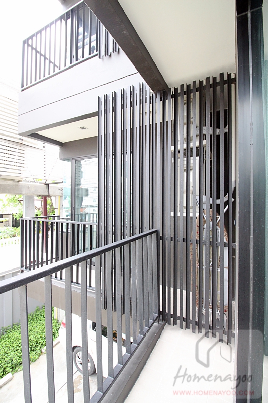 พื้นระเบียงปูกระเบื้องเซรามิกผิวด้านสีครีมขนาด 30 x 30 cm. มาให้ ราวกันตกเป็นเหล็กโปร่งทาสีดำและที่พื้นระเบียงเดินท่อระบายนำ้มาให้เรียบร้อย ระเบียงเป็นระเบียงแบบหน้ากว้าง และมีประตูเปิดออกเชื่อมส่วนห้องนอนใหญ่ ห้องอเนกประสงค์ และห้องครัวได้
