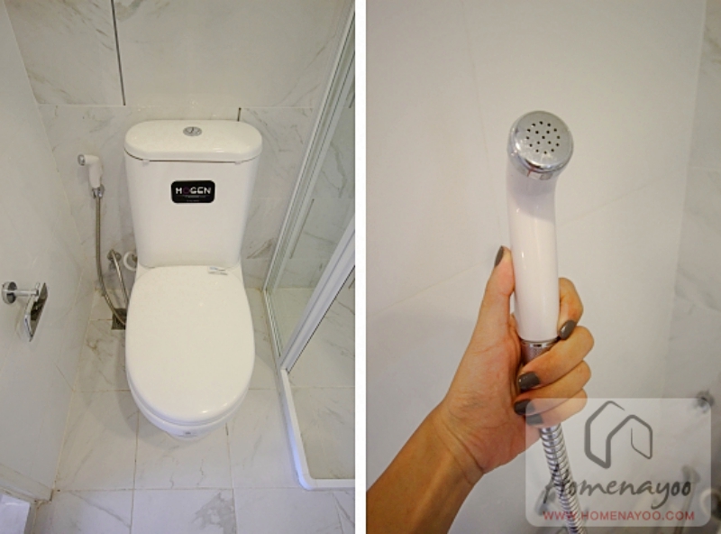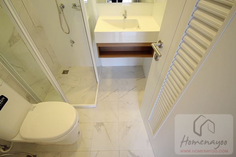 ส่วนห้องน้ำมีอ่างล้างมือ 1 อ่าง และโถสุขภัณฑ์ 1 ห้อง ส่วนจุดอาบน้ำมีฝักบัวมาให้ 1 ชุด พร้อมราวสแตนเลสไว้แขวนผ้าเช็ดตัว