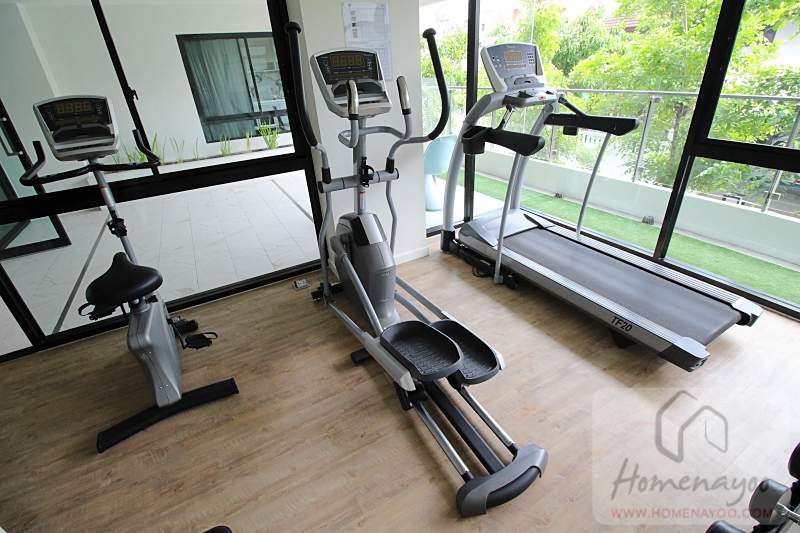 ห้องฟิตเนสมีผนังกระจกรับแสงธรรมชาติ ติดเครื่องปรับอากาศมาให้เรียบร้อย และวางเครื่องออกกำลังกายมาให้ประมาณ 5 เครื่อง