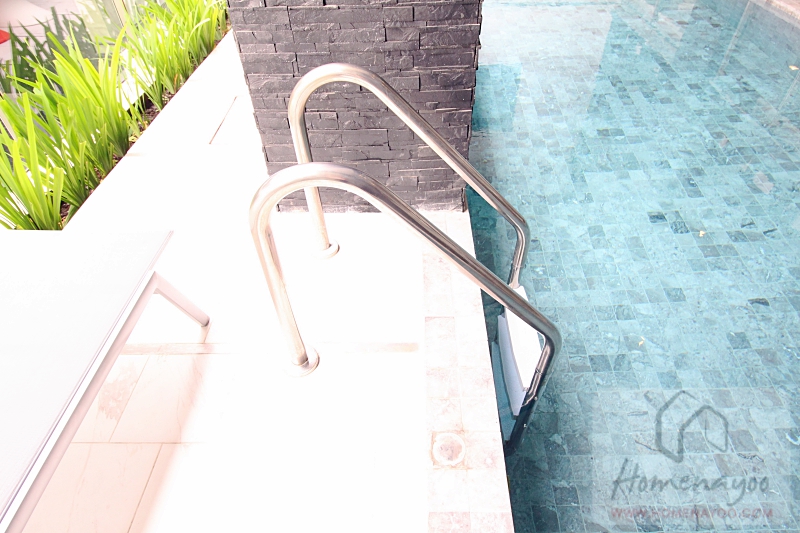 เราเปิดประตูเข้าไปดูส่วนสระว่ายน้ำกันต่อค่ะ ถัดมาจะมีบันไดขึ้นไปส่วนสระว่ายน้ำ พื้นปูกระเบื้องลายหินอ่อน