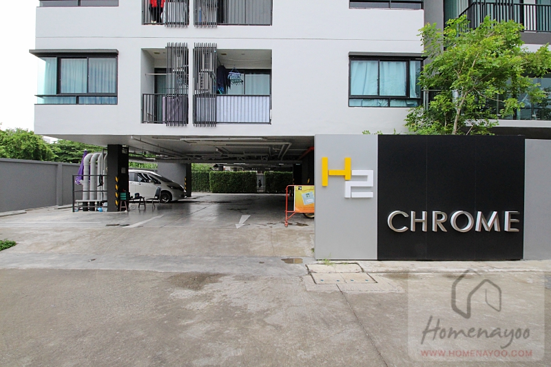 ด้านหน้าทางเข้าอาคารมีป้าย H2 CHROME ตามสไตล์ลอฟต์เข้ากันกับชื่ออาคาร พร้อมรั้วโครงการสูง 2 เมตร และมีแนวรั้วพุ่มไม้อีกชั้นเพื่อเพิ่มความเป็นส่วนตัวและบรรยากาศที่ร่มรื่น ตัวอาคารจะเป็นอย่างไรเข้าไปดูกันเลยค่ะ