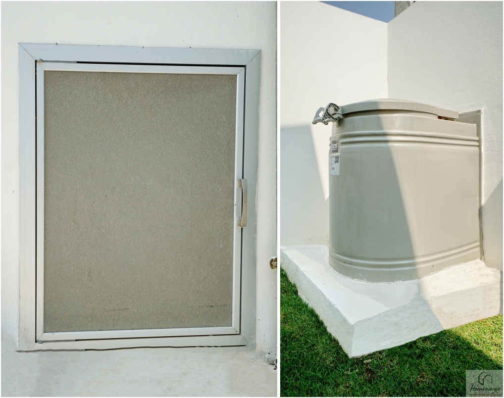อีกฝั่งจะเป็นถังขยะฝังกำแพง ใช้งานได้สะดวกสบาย เราสามารถทิ้งขยะได้จากในตัวบ้าน โดยไม่ต้องออกมานอกประตูรั้ว ส่วนพนักงานเก็บขยะ ก็ทำงานง่าย เพียงแค่เปิดบานประตูหน้าบ้านออก ก็นำขยะออกไปทิ้งได้เลย