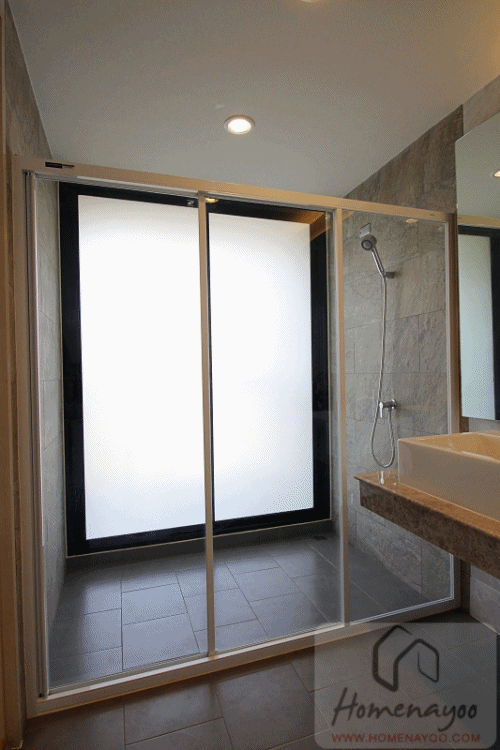 และที่ห้องน้ำมีความพิเศษคือจากห้องอาบน้ำมีประตูเปิดออกไประเบียงได้ เป็นประตูบานเลื่อนแบบ 3 ตอนลูกฟักกระจกฝ้า ที่ให้แสงธรรมชาติผ่านเข้ามาได้ และห้องน้ำมีความเป็นส่วนตัวอยู่