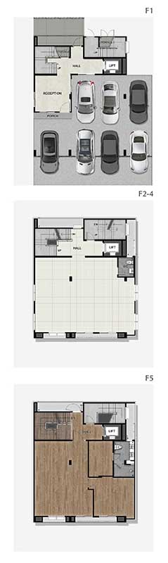 ชั้นที่ 1 จะเป็นลานจอดรถ เข้าไปในตัวอาคารเจอโถง Reception ด้านหน้า ฝั่งซ้ายเป็นบันไดหลักขึ้นสู่ชั้น 2 เดินผ่านโถง Reception เข้าไปด้านหลังจะเป็นโถงลิฟท์และส่วน Core ของตัวอาคาร ออกไปหลังบ้านเป็นลานซักล้าง บริเวณพื้นที่ด้านหลังนี้สามารถใช้เป็นพื้นที่ของแม่บ้านและ Pantry ได้ค่ะ