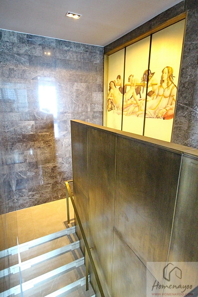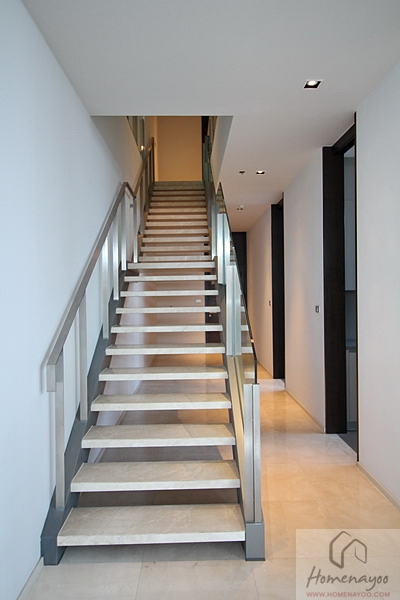 ข้างกันนั้นจะเป็นบันไดขึ้นไปยังชั้น 2 ค่ะ ด้านซ้ายที่เห็นเป็นทางเดินจะเป็นห้องครัวไทย ห้องเก็บของ และห้องนอนเล็กชั้นล่าง