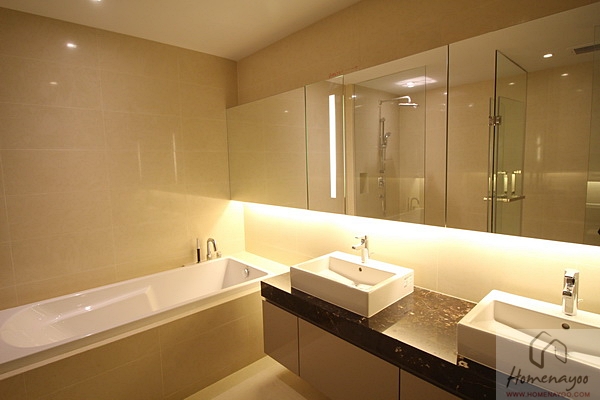 ภายในห้องน้ำค่ะ ห้องนี้อ่างล้างหน้าได้เป็นแบบ His&Her ไม่ต้องแย่งกันใช้งานในตอนเช้า ตรงกระจกก็เปิดเป็นชั้นเก็บของได้ ดังนั้นแยกอ่างได้เลยว่าใครใช้อันไหน