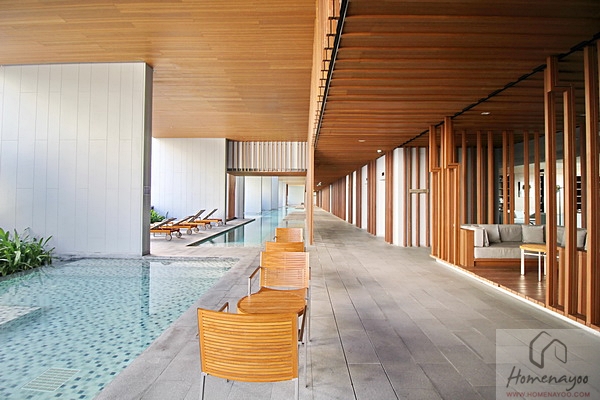 ด้านขวาจะเป็นส่วนของสระว่ายน้ำ พื้นจะเป็นไม้ตีห่างเว้นร่องค่ะ เหมาะสำหรับบ้านที่ชอบว่ายน้ำแบบมีความเป็นส่วนตัว และได้วิวสวยกว่าสระส่วนกลางค่ะเพราะเป็นชั้นบนสุดเลย
