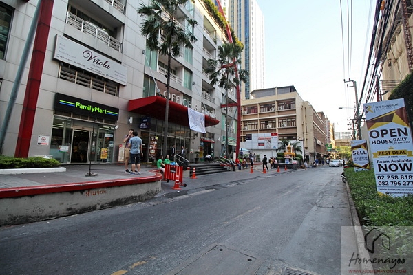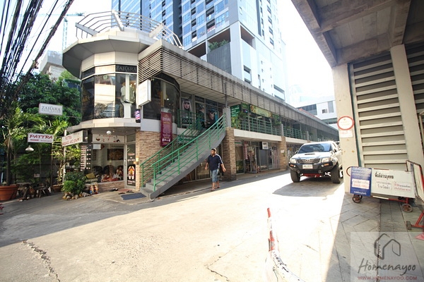 ตรงข้ามโครงการคือ Trendy Building จะเห็นว่าด้านล่างจะมีร้านค้า ร้านอาหาร ร้านสะดวกซื้อค่ะ