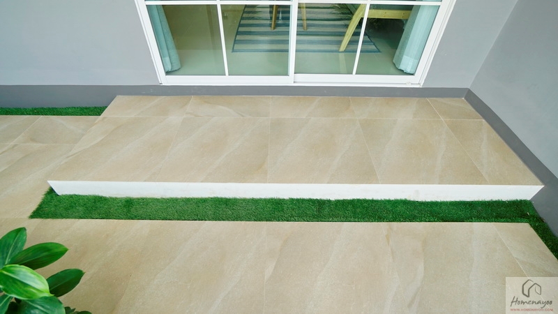 หลังบ้านจริงให้กำแพงทึบทั้ง 3 ด้าน มีลานซักล้างที่เชื่อมมาจากครัวใน ปูกระเบื้องเซรามิกกันลื่นมาให้เรียบร้อย โดยโครงสร้างจะวางบนคาน หมดปัญหาเรื่องการทรุดตัว ส่วนพื้นที่ที่เหลือจะสามารถปูหญ้าสนาม, หญ้าเทียม หรือจัดสวนในสไตล์ต่าง ๆ ได้ นอกจากนั้นยังมีการเดินงานระบบประปา-ระบบไฟฟ้า-ระบบสุขาภิบาลใต้ดินมาให้ครบเช่นกันค่ะ