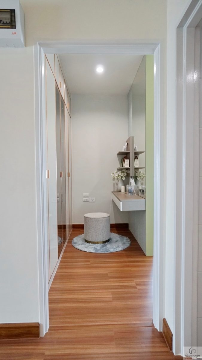 ส่วนแรกของห้องจะจัดเป็น Walk-in Closet มาให้ดูเป็นไอเดียแบบนี้ ภายในจะสามารถ Built-in ตู้เสื้อผ้าความสูงจรดฝ้าเพดานได้ 2 ตู้ อีกฝั่งสามารถเสริมทำโต๊ะเครื่องแป้งตัวยาว ขนาด 1 ที่นั่งได้อย่างลงตัว