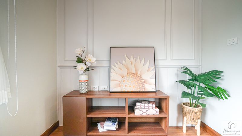 ตรงข้ามกันจะเป็นผนังเปล่าฉาบเรียบโล่ง ๆ รองรับชั้นวางทีวีตัวยาวได้สูงสุดประมาณ 1.5 ม.* ด้านหลังทีวีจะมีการเดินงานระบบไฟฟ้า ติดเต้าเสียบปลั๊กไฟ, ช่องเสียบสาย Cable TV และ Lan Internet มาให้พร้อมต่อใช้งาน