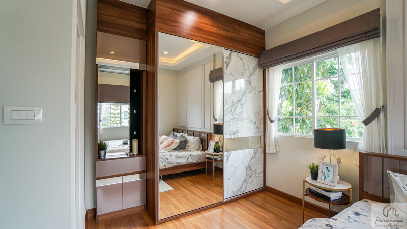 ข้างเตียงอีกฝั่งสามารถวางตู้เสื้อผ้าและโต๊ะเครื่องแป้งขนาดมาตรฐานได้แบบในบ้านตัวอย่าง และที่ผนังจะมีเต้าเสียบปลั๊กไฟติดมาให้ 1 จุด