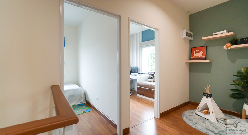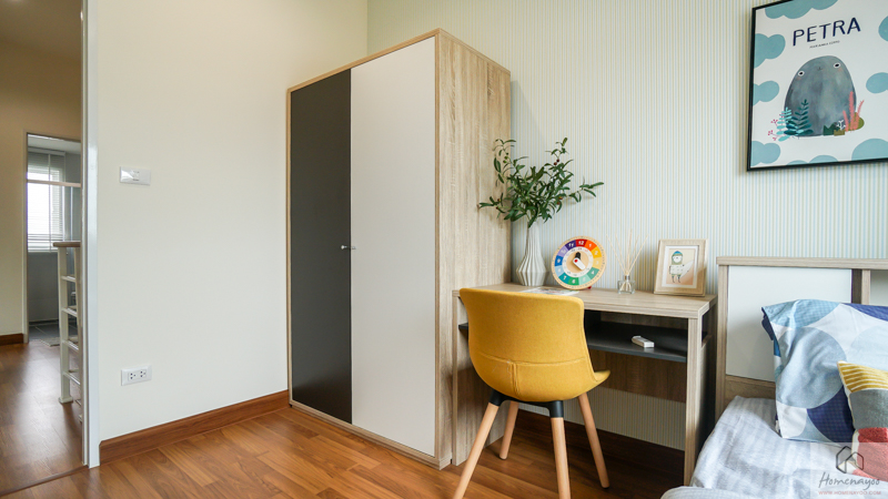 บ้านตัวอย่างตกแต่งเป็นห้องนอนเด็กมาให้ดูเป็นไอเดียค่ะ โดยจะวางเตียงเดี่ยว ขนาด 3.5 ฟุต ชิดผนังด้านใน และข้างเตียงวางโต๊ะญี่ปุ่นทำเป็นมุมวาดเขียน มุมอ่านหนังสือได้
