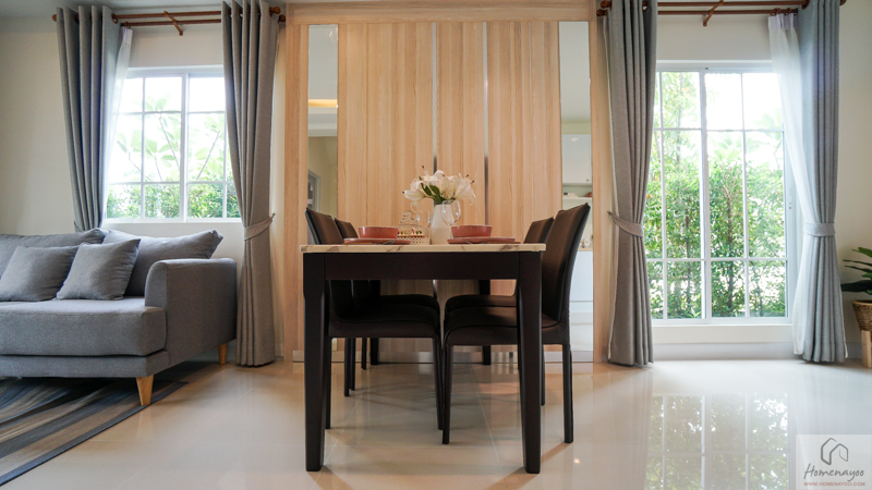 มุมทานอาหารได้พื้นที่มาค่อนข้างกว้างเลยนะคะ สามารถวางชุดโต๊ะทานอาหารขนาด 4 ที่นั่งได้ ระยะใช้งานรอบ ๆ เหลือสบาย ๆ เลื่อนเก้าอี้เข้า-ออกได้แบบไม่ติดขัด วันไหนมีเพื่อน ๆ มาหาที่บ้านก็สามารถเสริมเก้าอี้หัวโต๊ะและท้ายโต๊ะได้อีก 2 ตัว รวมให้เป็น 6 ที่นั่งก็ได้เลย