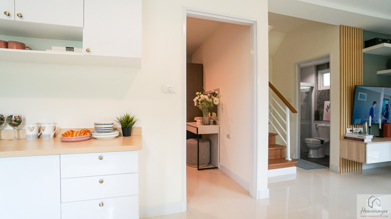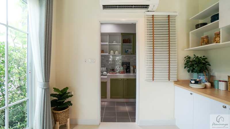 บริเวณนี้จะตกแต่งเป็นมุมเตรียมอาหารมาให้ดูเป็นไอเดีย ของจริงจะเป็นพื้นที่โล่ง ความกว้างประมาณ 2.5 ม.* โดยจะมีการเตรียมงานระบบต่าง ๆ มาให้แล้ว ถ้าชอบที่จะทำเป็นมุมเตรียมอาหาร ก็สามารถนำไอเดียไปต่อยอดได้เลยค่ะ