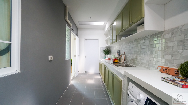 ถัดไปจะเป็นมุมเตรียมอาหารภายในบ้าน ที่เชื่อมกับหลังบ้านได้