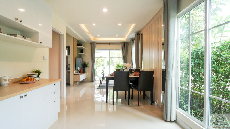 ภาพรวมทางฝั่งซ้ายมือจะเป็นห้องนั่งเล่น ถัดไปเป็นมุมทานอาหาร และมุมครัวเตรียมอาหารในบ้านที่มีขนาดกว้างขึ้น จากตรงนั้นจะเชื่อมตรงสู่ลานซักล้างหรือครัวนอกบ้านได้สะดวก