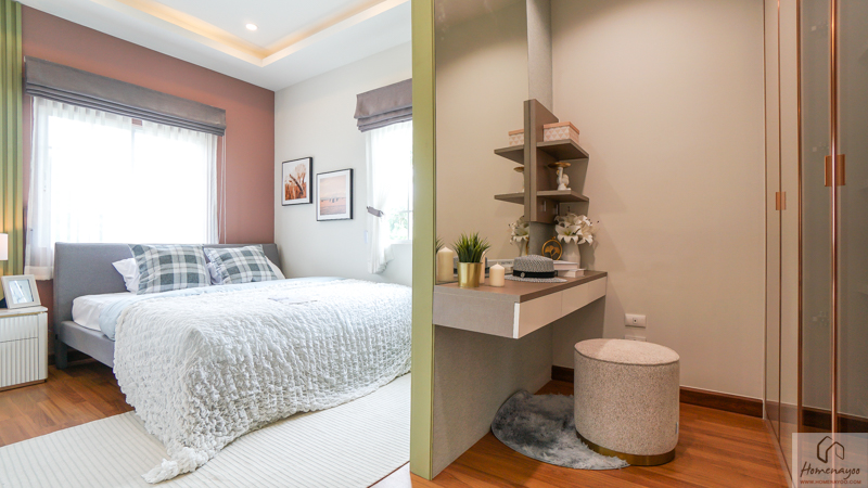 ภาพรวมเมื่อวางเฟอร์นิเจอร์ต่าง ๆ เข้าไปแล้ว ตรงกลางยังมีพื้นที่เหลือกว้างพอประมาณ ให้เรานั่งแต่งหน้า เปิด-ปิดตู้เสื้อผ้า ยืนแต่งตัวและยืนส่องกระจกเช็กความเรียบร้อยได้สะดวก
