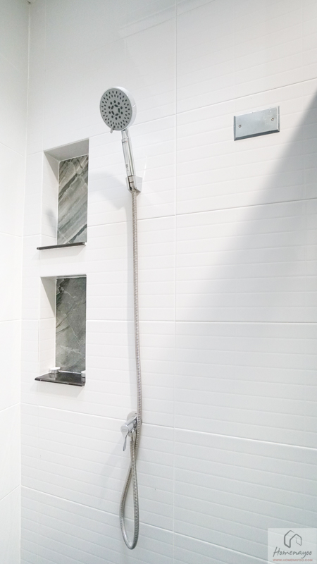 ด้านในจะติดตั้งฝักบัวสายอ่อน ก๊อกน้ำก้านโยก ผนังด้านซ้ายเจาะช่องทำชั้นวางของมาให้ 1 ชั้น และที่ด้านขวามือจะมีการเดินงานระบบไฟฟ้า ติด Junction Box เพื่อรองรับการติดเครื่องทำน้ำอุ่นได้อย่างปลอดภัยค่ะ