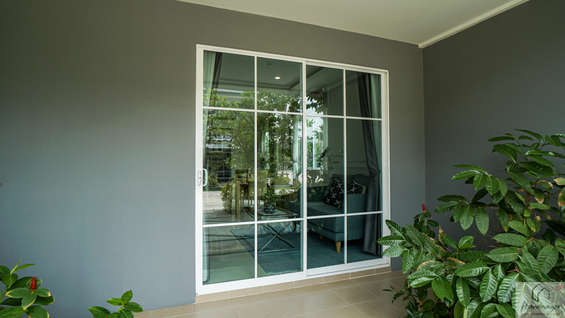 บ้านตัวอย่างจะเป็นหลังมุมทำให้ข้างบ้านมีหน้าต่างกระจกบานเลื่อน + ประตูกระจกบานเลื่อนเปิดเชื่อมสวนติดมาให้รวม 2 บาน โดยหน้าต่าง-ประตูกระจกบานเลื่อนทุกบานในบ้าน จะได้เป็นกระจกเขียวตัดแสง บานกรอบอะลูมิเนียม Powder Coat สีขาว มีการจัดทำขอบกันน้ำ (Double Protect) เพื่อช่วยป้องกันน้ำรั่วซึมอีกชั้นหนึ่ง