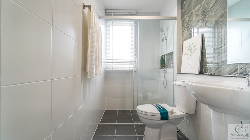 ถัดมาจะเป็นส่วนอาบน้ำ ในบ้านจริงจะไม่มีฉากกั้นอาบน้ำให้นะคะ ใครที่ชอบความเป็นสัดส่วนแบบบ้านตัวอย่าง ก็สามารถติดผ้าม่านกันน้ำหรือจ้างช่างมาติดฉากกั้นเพิ่มเองได้เลยค่ะ