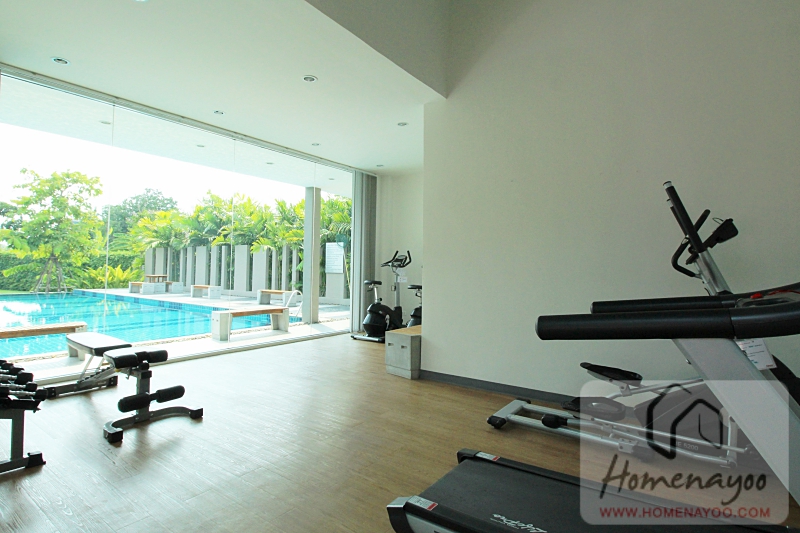 ผนังด้านนึงของห้องฟิตเนสเป็นกระจกใสเห็นวิวสระว่ายน้ำและสวนสาธารณะของโครงการ
