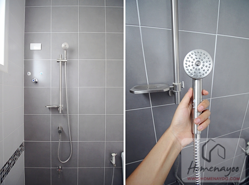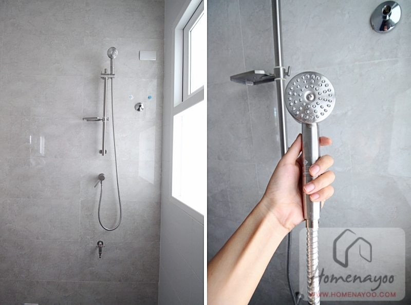 ที่ผนังมีเตรียมงานระบบสำหรับเครื่องทำน้ำอุ่นมาให้เรียบร้อย และมีที่วางสบู่ติดผนังมาให้ เทียบฝ่ามือดู ฝักบัวให้ขนาดมากำลังดีและเป็นแบบเดียวกันกับห้องน้ำห้องอื่นๆ
