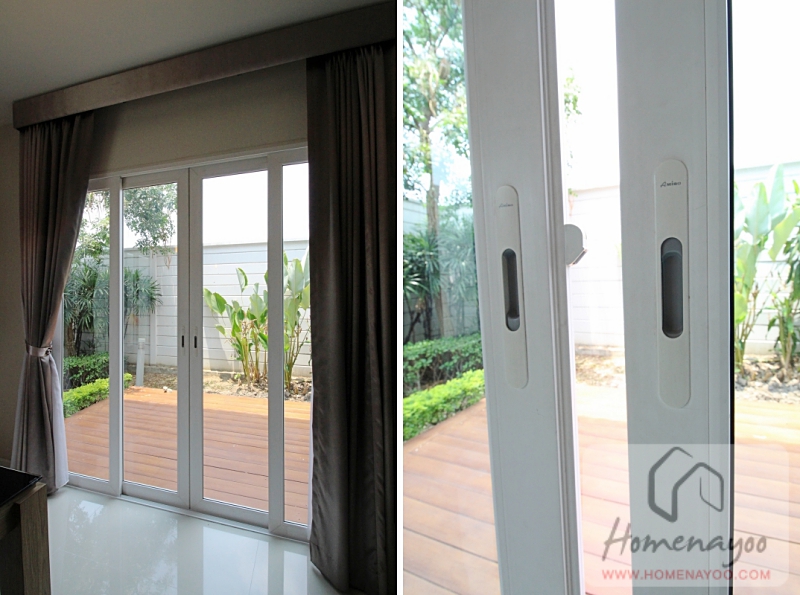 ถัดไปเป็นประตูครัว ซึ่งเป็นประตูบานเลื่อนแบบแขวนรางด้านบนนะคะ เป็นครัวปิดช่วยกันควันอาหารเวลาทำกับข้าวได้ดี ของจริงได้ตามนี้ เราไปดูส่วนห้องครัวกันต่อ