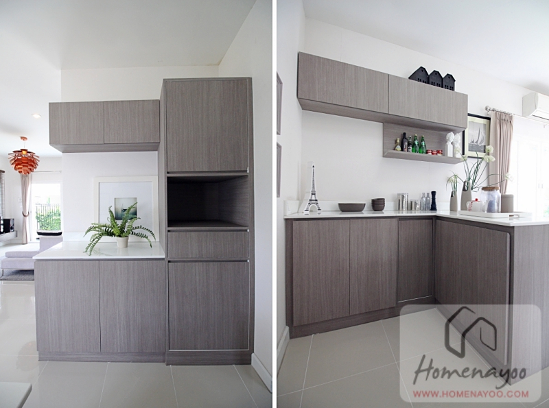 บ้านตัวอย่างทำเคาน์เตอร์ Built in มาให้ดูเป็นไอเดีย ของจริงจะเป็นห้องโล่งนะคะ ภาพซ้ายคือเคาน์เตอร์ฝั่งซ้ายมือ ภาพขวาคือเคาน์เตอร์ฝั่งขวามือรูปตัว L