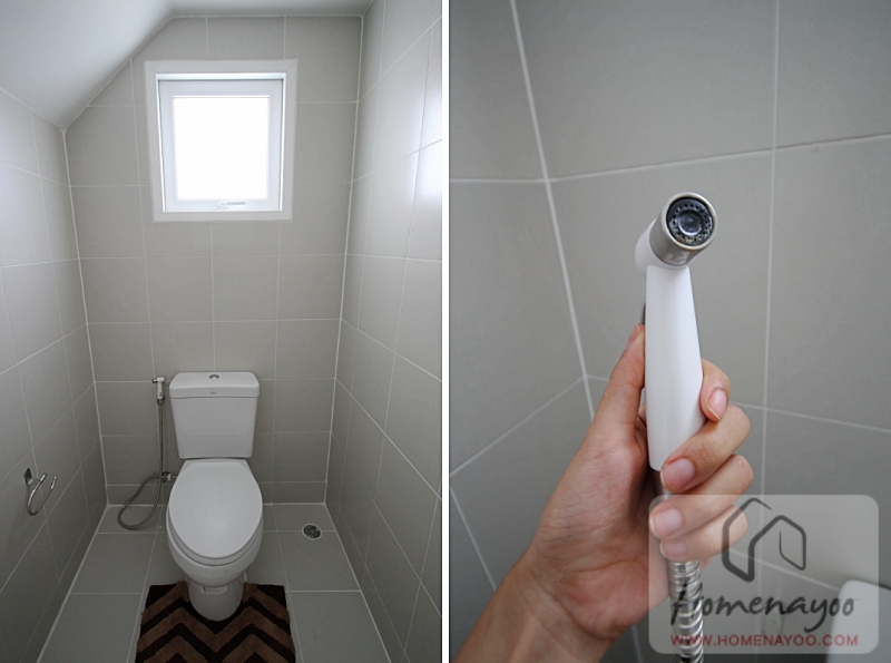 ผนังปูกระเบื้องมาให้จรดเพดาน และมีหน้าต่างบานกระทุ้งมาให้ 1 ชุดไว้ระบายอากาศ เพดานติดไฟดาวน์ไลท์