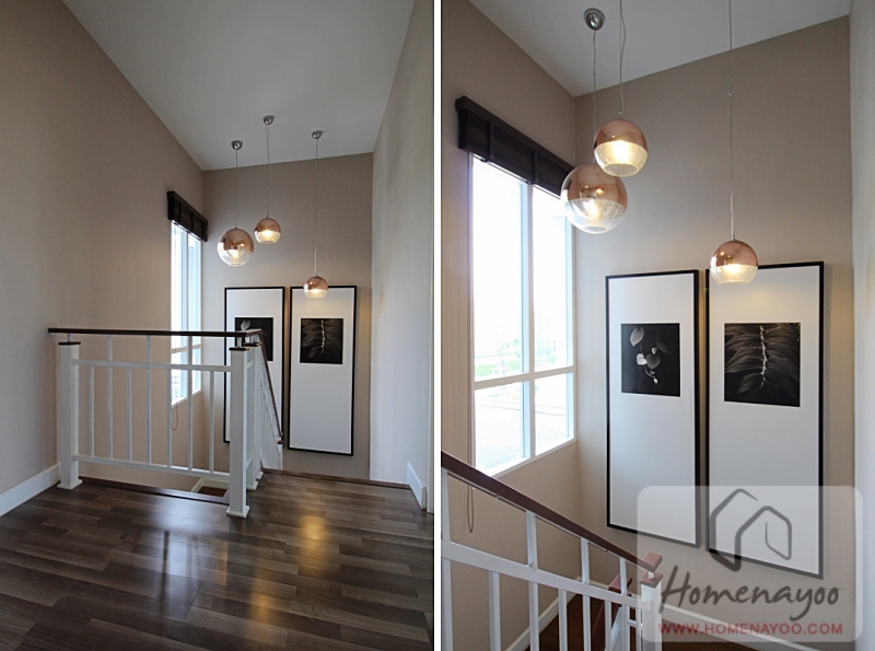 ตัวโถงบันไดฝ้าเพดานจะเป็นแบบเรียบติดไฟผนังมาให้ฝั่งนึงนะคะ ตอนกลางวันมีช่องแสงธรรมชาติมาให้ใหญ่ดี ของจริงได้ตามที่เห็นค่ะ